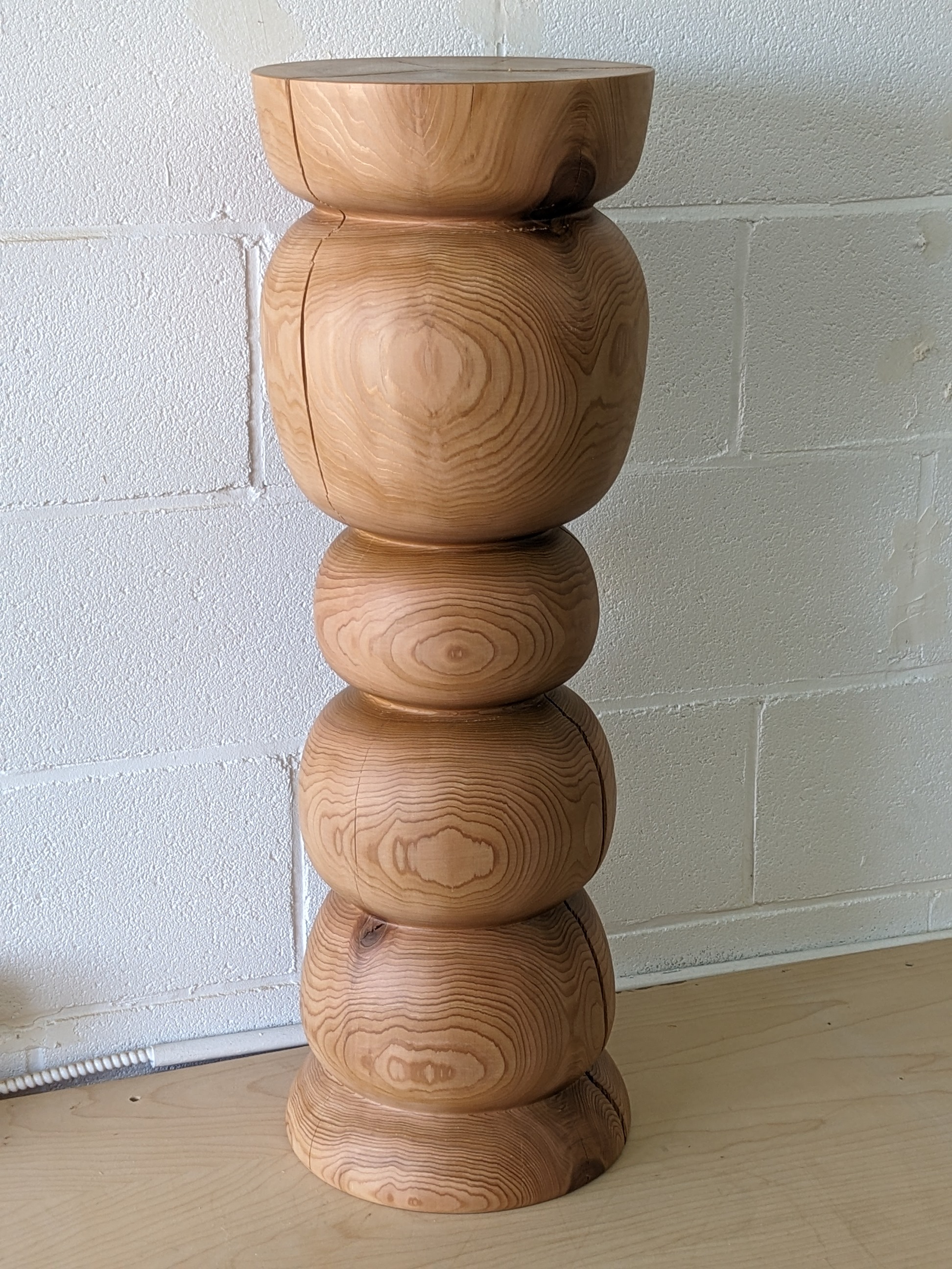 Shape of simplicity turned on a wood lathe. This pedestal is made of Western Red Cedar and has been finished with an eco/kids friendly blend of vegetal oil and wax